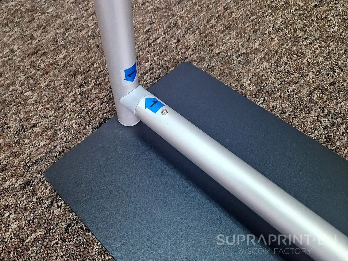 Sercem systemu jest lekki, a jednocześnie wytrzymały profil aluminiowy o średnicy Ø 25 mm. Zamiast klasycznych nóg zastosowano metalową płytę, która znacząco zwiększa stabilność całej konstrukcji. To rozwiązanie sprawia, że stand doskonale sprawdza się nawet w miejscach o dużym natężeniu ruchu – takich jak galerie handlowe, targi czy konferencje.